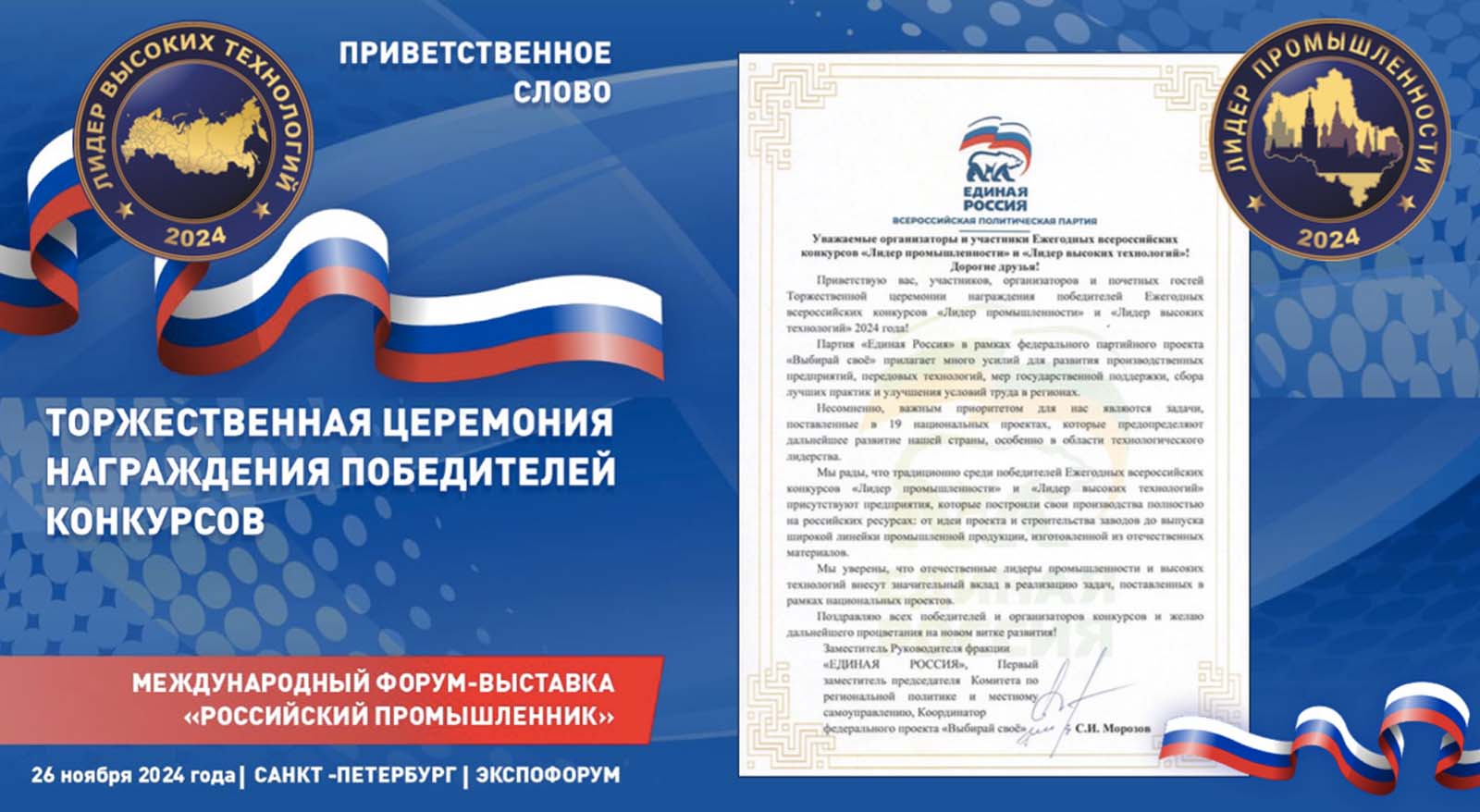 26 ноября 2024 года в г. Санкт-Петербург в КВЦ ЭКСПОФОРУМ состоялась Торжественная церемония награждения победителей Ежегодных конкурсов «Лидер промышленности» и «Лидер высоких технологий» - 2024 в рамках 28-го Международного форума-выставки «Российский промышленник»