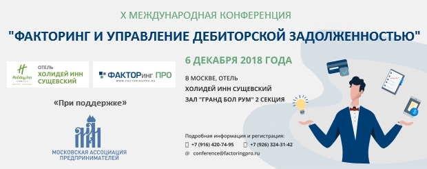 Компания «ФАКТОРинг ПРО» при поддержке Московской ассоциации предпринимателей приглашает Вас принять участие в работе X-ой ежегодной международной конференции «Факторинг и управление дебиторской задолженностью».